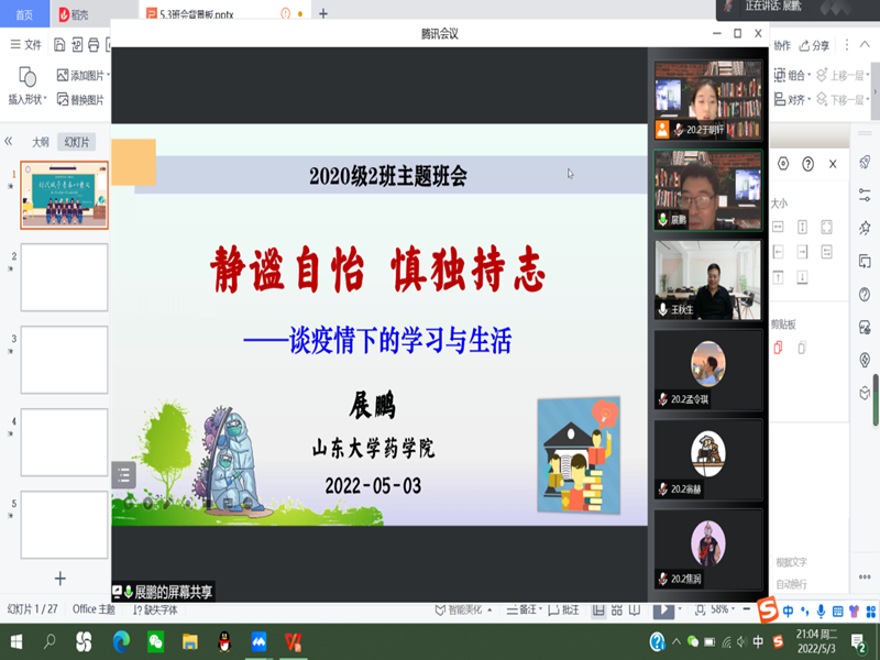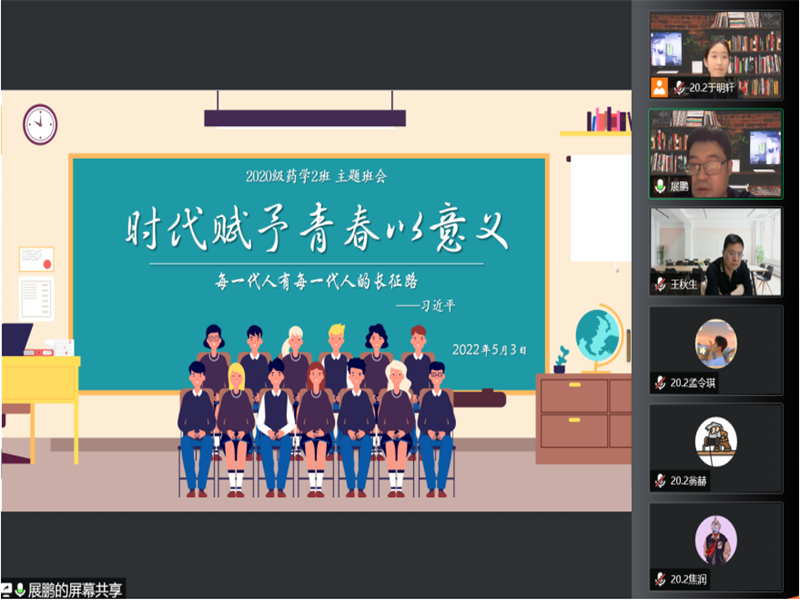 在五四青年节来临之际,为增强同学们的青年使命感,加强师生交流,5月3日晚上21时,304am永利集团2020级药学2班开展“时代赋予青春以意义”线上主题班会。304am永利集团党委书记王秋生和班主任展鹏出席会议,班长于明轩主持会议,全班同学参加。