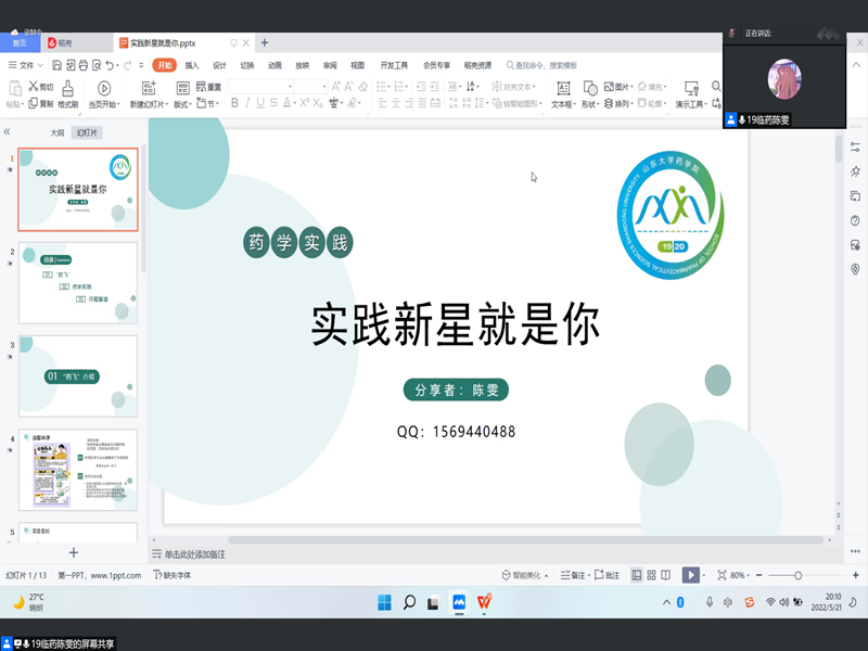 然后,陈雯以“药飞”为例,从选题来源、项目目的、实践流程、调研结果四个主题对专业性较强的药学社会实践选题进行介绍,阐明了此类社会实践的主要目的。此外,她也解答了有关选题和与专业人士对接等问题。