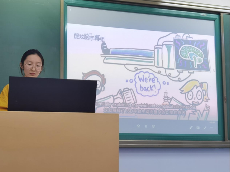 之后,陶思凝采用拟人的手法,从麦角的视角向同学们展示了麦角从发现到临床应用的过程,用英文视频向大家科普了麦角的致幻作用及其作用机理,让大家在了解相关知识的同时增强了英语听力能力,其后,陶思凝还对麦角中的化学结构做出了详细介绍,让同学们对麦角这一药物有了更加清晰的认识。