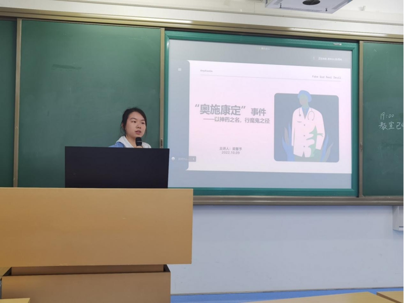 作为第一位主讲人,梁馨予以美剧《成瘾剂量》的剧情为引,讲述了一次药物滥用的真实事件,突出了药事管理的重要性,引起同学们的深思和讨论。随后,孟令琪以《解密肌松药》为题,系统地阐述了肌松药的分类、作用机制、临床应用及不良反应,并联系药理学的相关专业知识,指出了天然产物对于科学研究的重要作用。