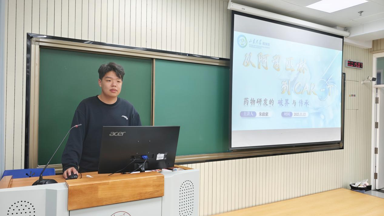 第五位演讲人朱政豪以《从阿司匹林到CAR-T:百年药物研发的“破界”与“传承”》为题展开论述。他在带领同学们回顾百年医药发展历程中,深入剖析了药物研发从阿司匹林到CAR-T细胞免疫疗法进程中不断突破传统界限、实现创新发展的关键节点,以及不同阶段药物研发理念与技术的传承与演进。