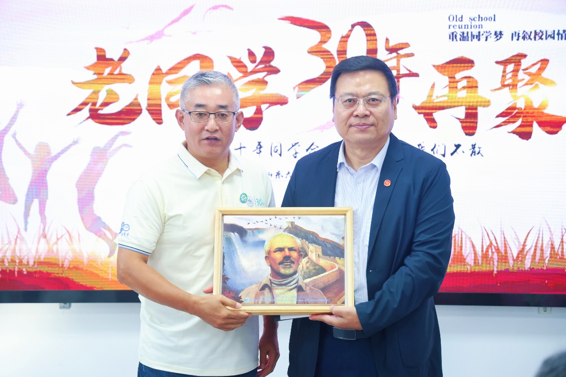 校友王灵光代表91级向学院赠送了精心准备的纪念品,这份纪念品承载着校友们对母校的深厚情谊,象征着校友与母校之间割舍不断的血脉联系。