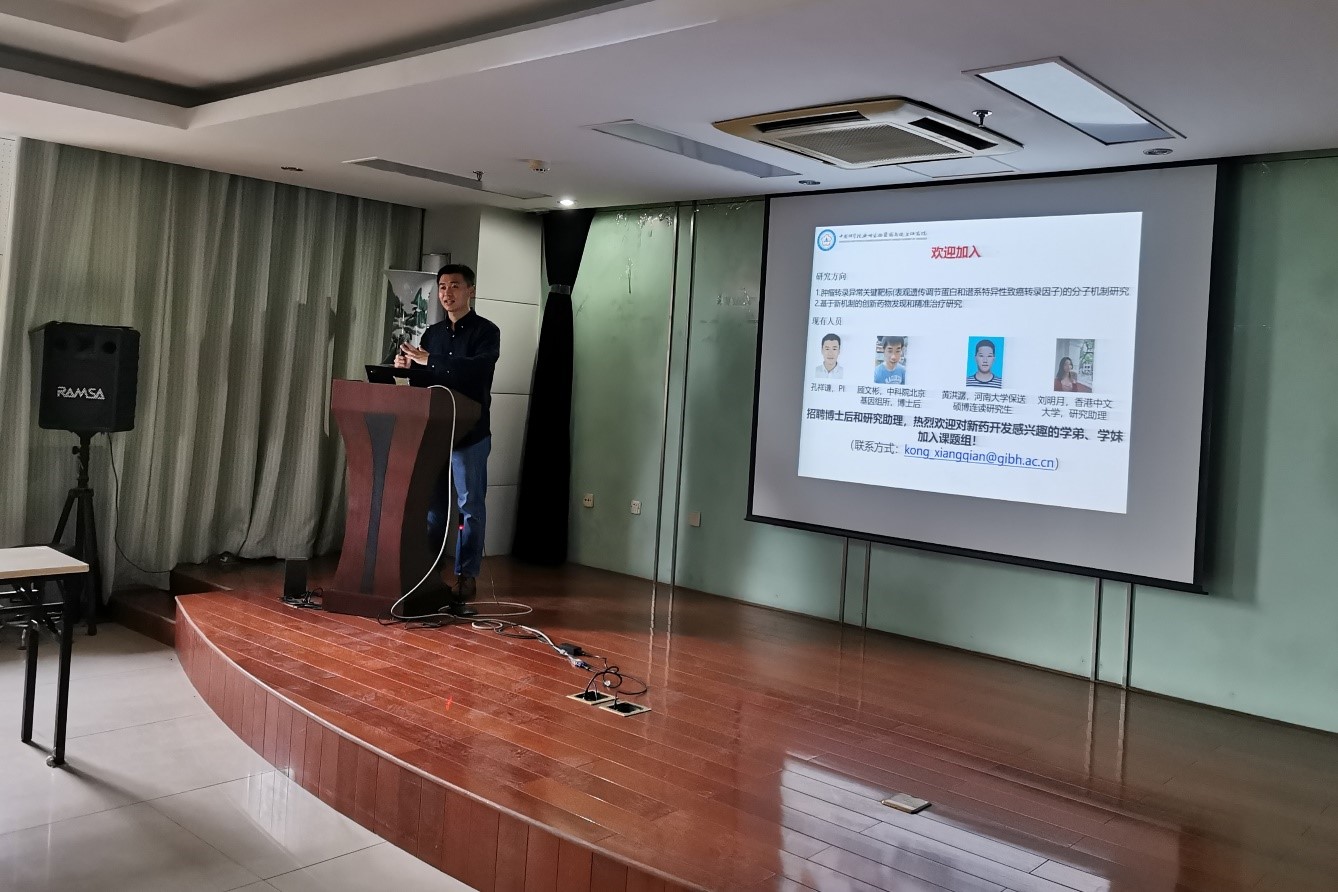 孔祥谦作了题为“基于表观遗传调控的创新药物发现和细胞命运调控研究”的学术报告。介绍了对维持DNA甲基化的关键蛋白UHRF1功能的研究及药物筛选策略,此外还介绍了OCT4与DNA相互作用的机制研究及表观遗传调控策略。