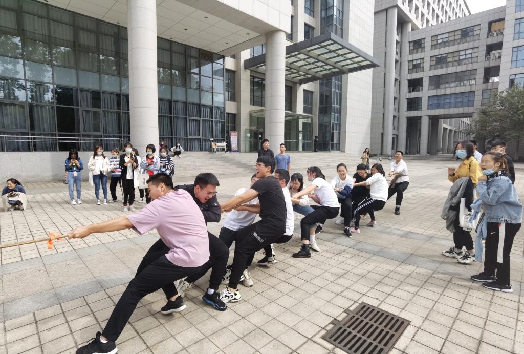 2020级本科生班级拔河比赛在中心校区知新楼前举行。比赛采取淘汰制晋级的方式,参加拔河比赛的4支队伍分别由四个班级产生的6名男生和6名女生代表组成,各班文体宣委员赛前抽签分组决定比赛顺序。这是2020级新生第一次集体为班级争荣誉的活动,同学们合理规划比赛站位,精神饱满,斗志昂扬。该项目不仅加深了新生彼此的了解,同时也增强了班级内部的凝聚力和竞争意识。其它年级本科生和研究生主要以微信步数打卡、Keep健身打卡和线上仰卧起坐比赛等线上与线下相结合的形式开展迎国庆系列体育锻炼活动。