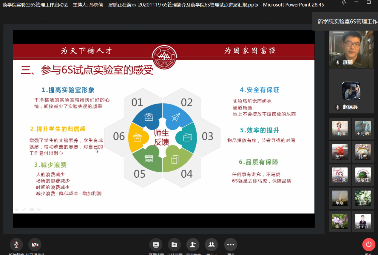 会议伊始,作为6S前期试点工作的参与者,展鹏教授对6S管理的发展历史和理念进行了介绍,并展示了试点过程中,我院培育的6S规范化实验室“日新月异”的全过程。安全舒适、整洁有序的实验室环境,使得6S管理理念深入人心,更重要的是消除了安全隐患,提高了科研效率。