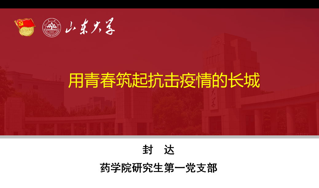 该党课讲述了我院药物化学研究所及研究生第一党支部的师生们面对突如其来的新冠疫情,发挥专业优势,在多年抗病毒药物研究的基础上,基于新型冠状病毒的蛋白结构,开展了计算机智能化辅助的高通量药物虚拟筛选,采用老药新用的策略,发现多个虚拟评价活性好的分子结构;同时还调动企业/科研院所、国际合作伙伴等一切资源,建立抗新冠病毒药物研发平台。在抗击疫情期间,药化所的师生们牢记为国家图富强的担当与职责,肩负强校兴国的历史使命,用青春筑起了抗疫阻击战的长城,彰显了学无止境,气有浩然的山大精神,为夺取抗疫全面胜利源源不断地贡献山大智慧与山大力量!
