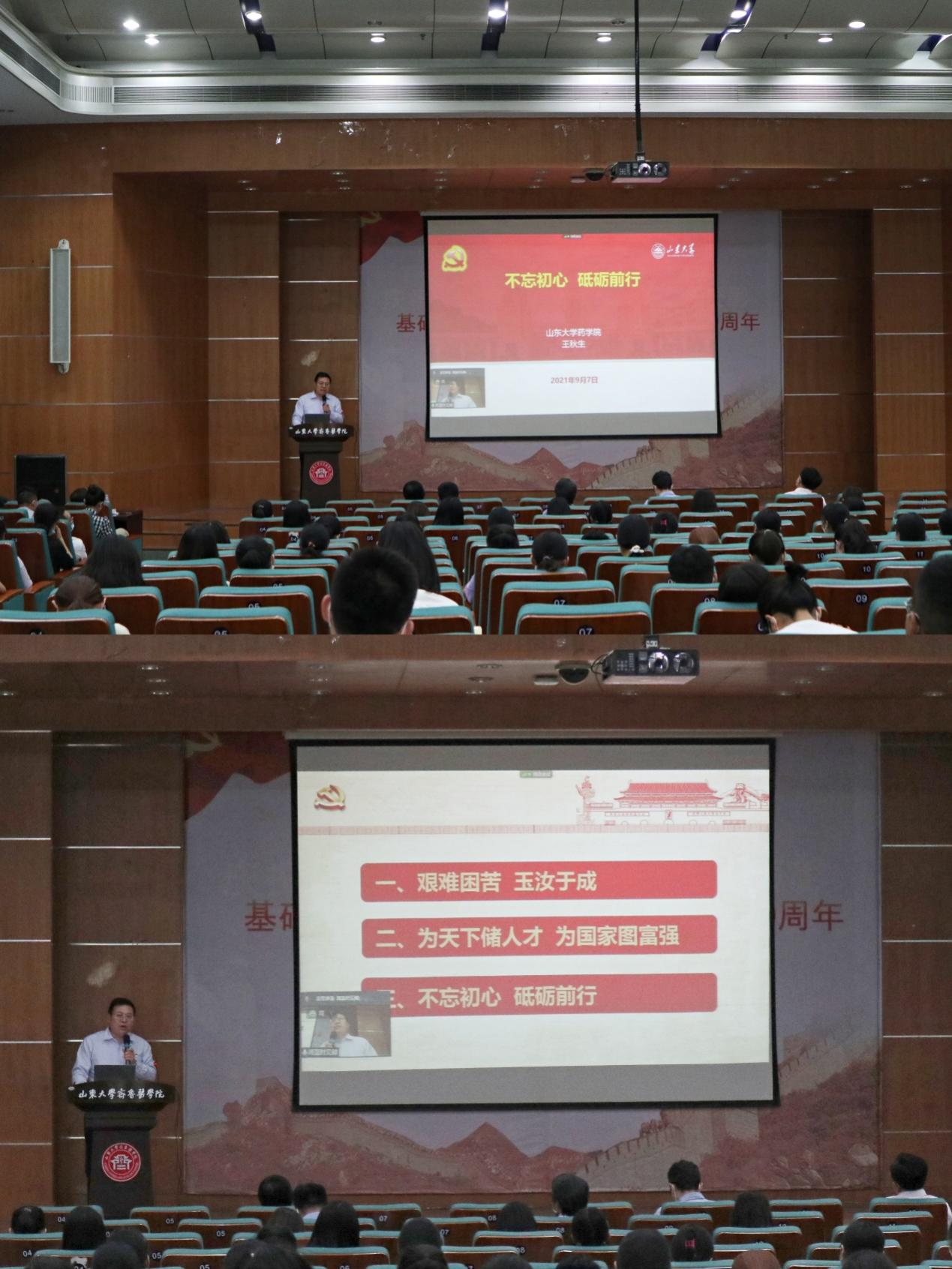 王秋生书记以“不忘初心,砥砺前行”为主题,介绍了中国共产党从艰苦奋斗的创建之初走向新世纪伟大复兴的光辉历史以及学校和学院从创建到壮大的红色足迹,希望同学们作为新时代的山大人要有奉献精神和爱国精神,将个人与国家的命运紧密相连,为祖国医药事业发展贡献力量。