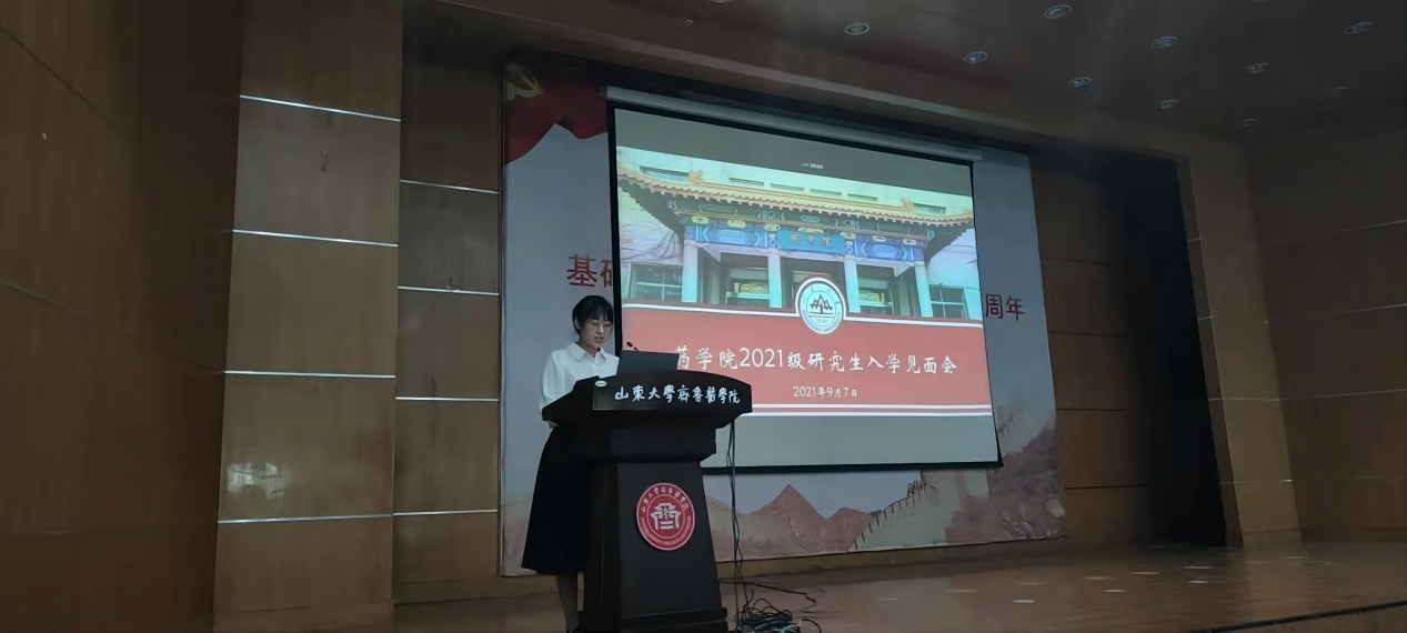 2021级新生代表马晓博表达了全体新生对研究生生活的期待,表示要尽快适应新的学习生活,积极进行学习和实践,带着山大人传承百廿的荣誉向更高更远处不断求索,为祖国医药卫生事业发展奋斗终身。