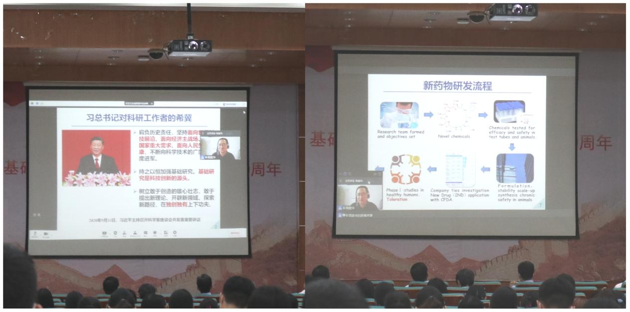 鞠建华院长从习近平总书记对科研工作者的希冀出发,认为作为新时代的科研人要面向科技前沿、面向经济主战场、面向国家重大需要、面向人民生命健康,加强基础研究,在独创独有上下功夫。他强调在新药的研究和开发中创新的重要性,希望研究生要怀揣远大目标,激发创新能力,敢于探索新路径和新理论,为实现自己的理想努力奋斗,推进我国原创药物的发展。
