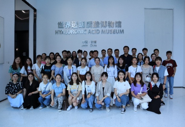 本次交流会共分为三个环节。首先,PI团队全体师生在郭学平研究员的带领下共同参观了华熙生物世界透明质酸博物馆。博物馆分为“透明质酸---人体不可或缺的物质、透明质酸的起源、提取法的黄金时代、发酵法诞生及发展轨迹、全球最大的透明质酸研发生产基地”五大展览单元。在郭老师和讲解员的讲解下,师生们了解到了透明质酸的前世今生及其未来前景。团队成员们还在此体验了透明质酸领域的最新研发成果。