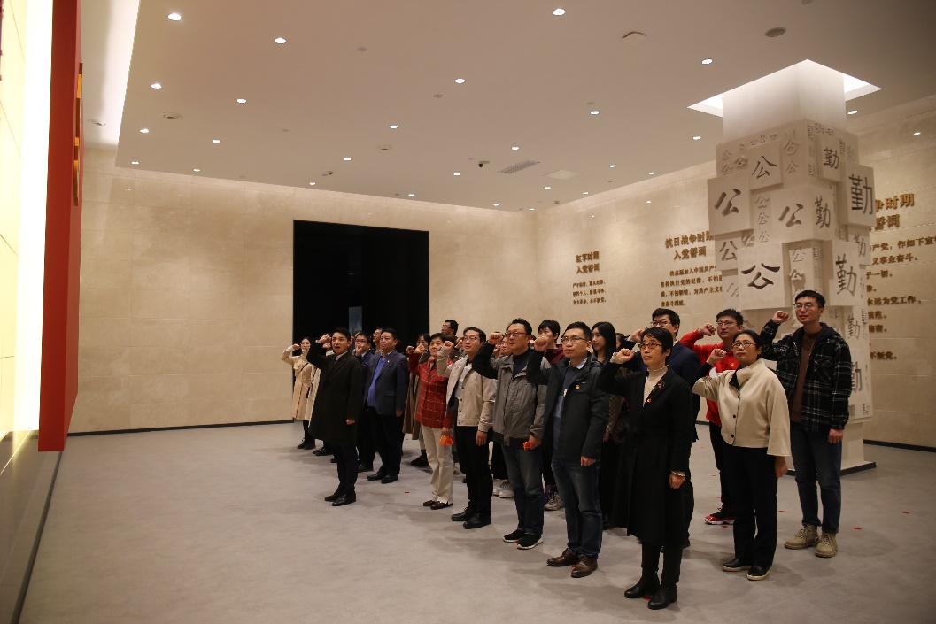 在宣誓厅,全体党员面向党旗,紧握右拳,重温入党誓词,鲜红的党旗辉映着胸前的党徽,激昂的誓言在大厅回荡,大家的心情久久不能平静。