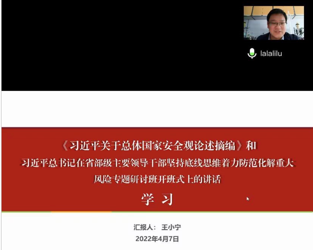 会上大家集中学习了《习近平关于总体国家安全观论述摘编》、习近平总书记在省部级主要领导干部坚持底线思维着力防范化解重大风险专题研讨班开班式上的讲话、信访工作条例等文件精神,详细学习了习近平总书记关于总体国家安全观及政治、科技、网络、生态等十二个重点领域安全的丰富内涵,学习了总书记对着力防范化解重大风险的总体要求,并结合学院加强党的建设、网络阵地监管、实验室安全及各级责任落实等重点工作展开研讨,并从五个方面形成加强改进措施,一是提高认识,明确当前面临的形势任务;二是总结经验,构建全覆盖的安全工作体系;三是主动担责,扎实抓好安全工作重点任务;四是着眼长效,加强安全工作制度化、规范化建设;五是改进作风,注重工作方式方法,筑牢立体安全网。