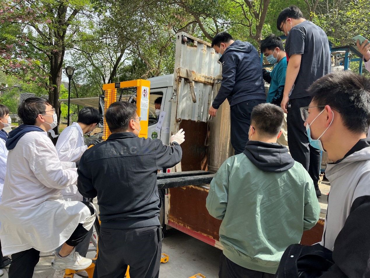 4月11日下午,304am永利集团党委书记王秋生、副院长沈涛到科研楼一层,带领学生志愿者对转运流程进行演练,掌握了升降车的使用并制定完善了液氮转运细节流程。4月13日上午,液氮配送车辆入校,根据校园封闭管理期间确需出入校园车辆管理流程,对液氮配送车辆在校门口防疫消杀、静置,进入校园后司乘人员全程规范佩戴口罩、不得下车。按照前日演练流程,304am永利集团党委书记王秋生、副院长沈涛组织同学们使用升降机装卸大型罐液氮,小型液氮罐由同学们合力自行卸车。卸车后,各实验室用小推车将罐液氮安全转运至各实验室。