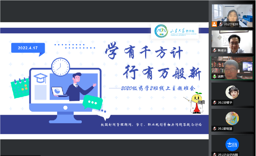 共话学业,筑梦未来。院长鞠建华、党委副书记王巍巍、副院长沈涛分别与所联系班级学生在“云端”见面共话学业。他们就大二阶段学生密切关注的大创项目开题、专业英语学习、科研能力提升、职业生涯发展等学业问题为同学们提出建议、答疑解惑。鼓励同学们夯实基础,关心药物研发前沿动态,奋楫扬帆筑梦未来。