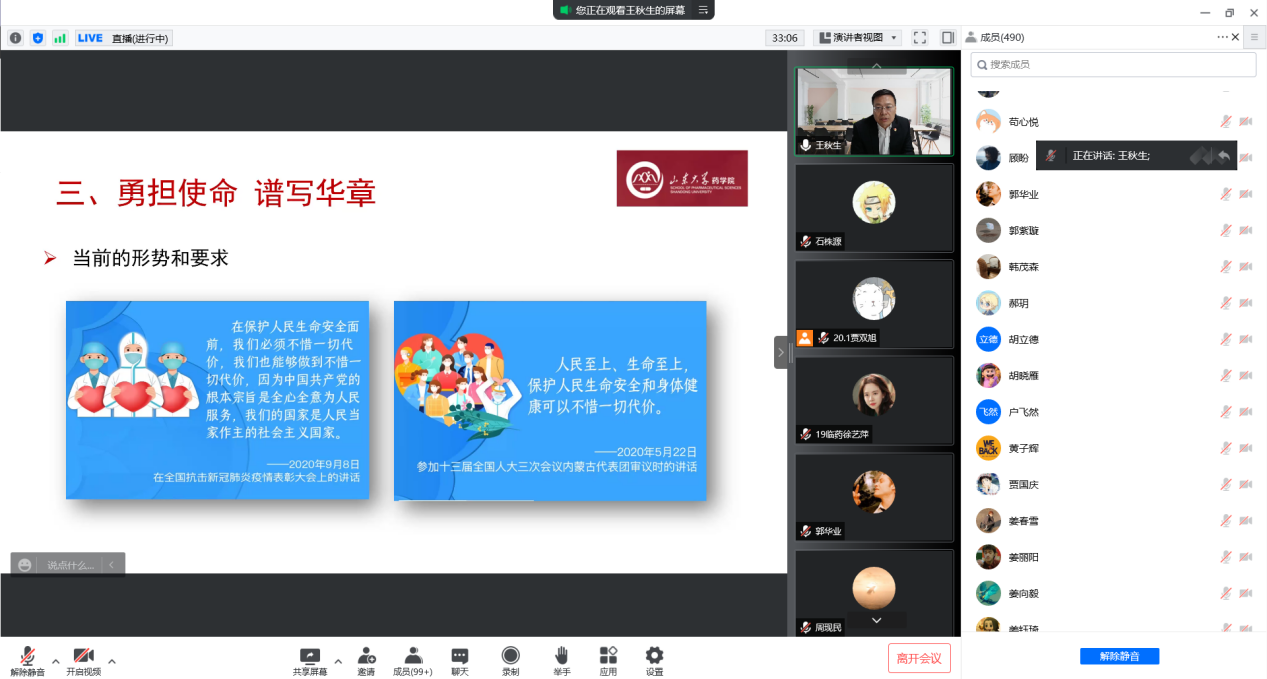 王秋生结合齐鲁医学与五四运动的历史,带领同学们学习齐鲁医学前辈先贤波澜壮阔的反帝爱国斗争历史,重温齐鲁医学青年伟大的家国情怀,让“爱国、进步、民主、科学”的五四精神深入同学们心中,教育引导同学们要树立伟大理想、热爱伟大祖国、担当时代责任、勇于砥砺奋斗、练就过硬本领、锤炼品德修养。重点强调青年人之于国家、之于时代的重要性,责任与荣耀同在,要求同学们不负韶华,不负党和人民的殷切期望,不负习近平总书记对青年们的期望。
