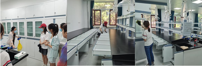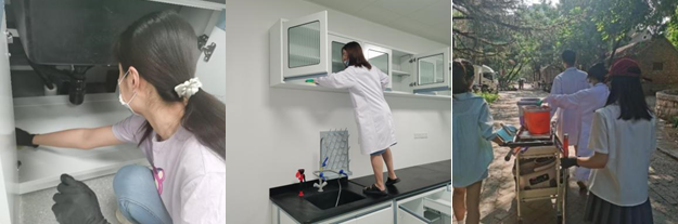 群众有需求,党员有行动。早八点,十余名支部志愿者按时到达教学七号楼,协助学院一起进行实验室搬迁前的卫生整理工作。在实践活动中,党员志愿者主要负责实验桌面的整洁、大小实验柜的卫生以及地面、窗台的干净。无论是高处的吊柜还是深处的角落,党员同志们都认真细致地进行了清理,杜绝卫生死角。各党员同志始终听从在场工作人员的要求,遇到问题及时与老师进行沟通,确保工作的顺利完成。