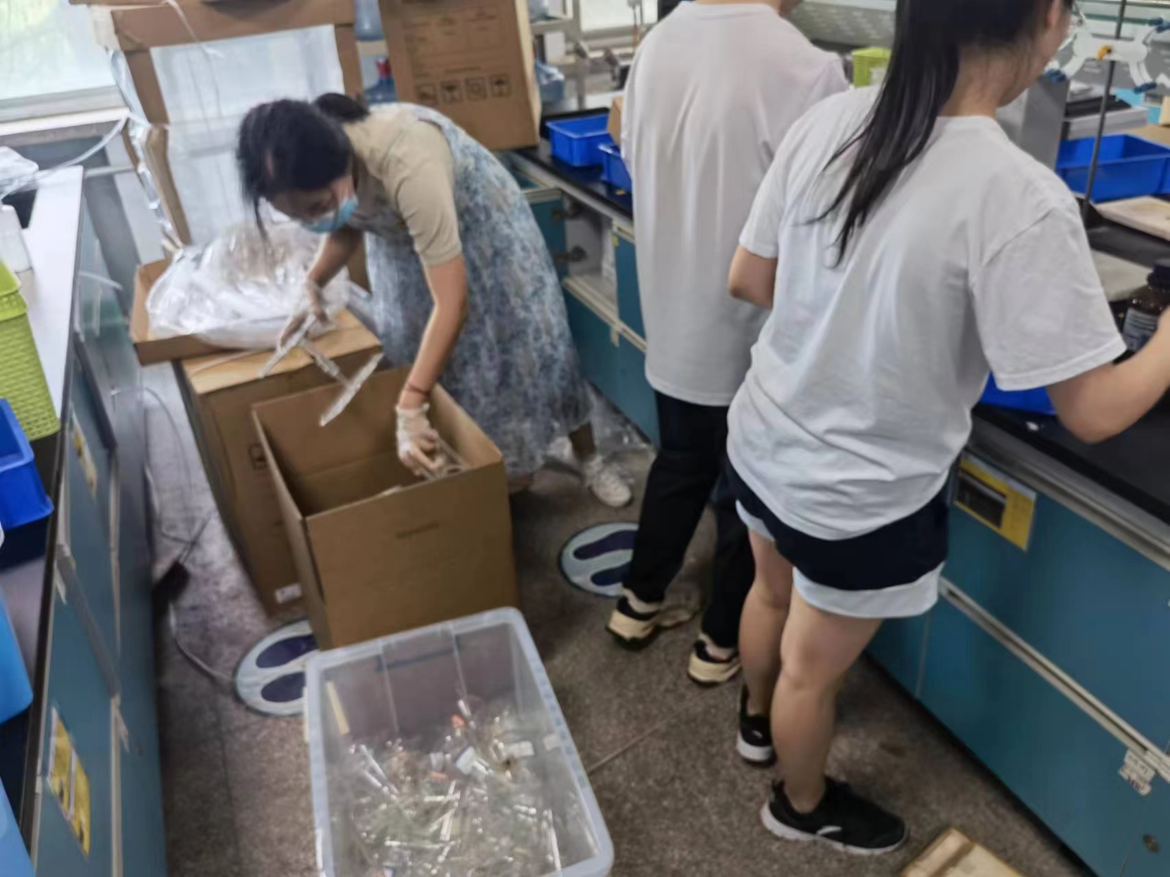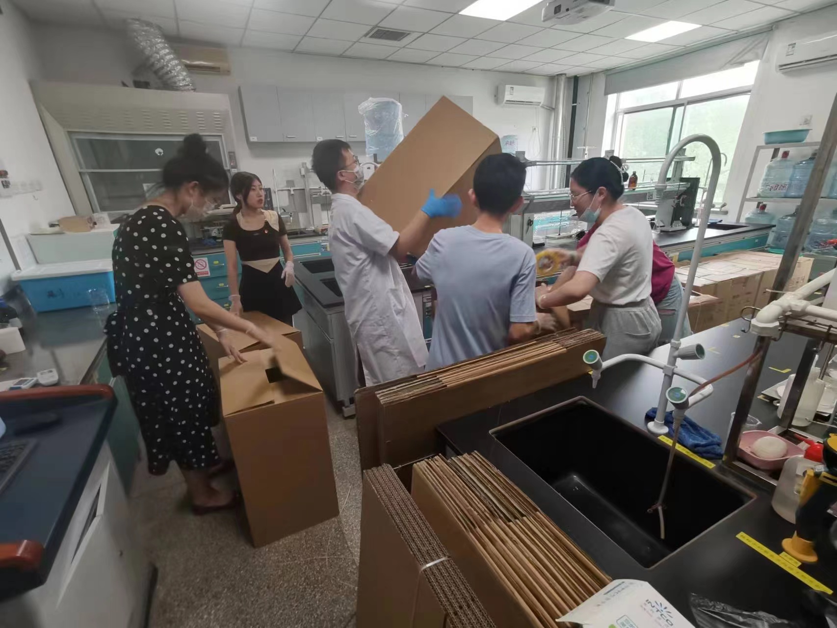 6月22日,304am永利集团7号楼药物分析教学实验室搬迁,各实验室药物试剂装箱打包任务繁重,仅靠平台几位老师难以在规定时间内完成搬迁任务。学院党委号召党员先锋力量加入搬迁工作,在党委号召和各学生党支部积极响应下,迅速集结34名党员和积极分子加入到搬迁队伍。下午2:30,志愿者们冒着烈日到达搬迁地点,简单分工后即投入装箱打包整理工作。整理工作繁重,且有可能接触化学试剂,同学们以高度的责任心和专业性,高效完成。过程中很多同学磨坏了四五副手套,也有的同学不小心磕到受了轻微伤,但大家任劳任怨。当老师询问时,一名党员说:没事老师,志愿服务本来就辛苦也是应该的,只希望能尽一己之力得到认可就好!