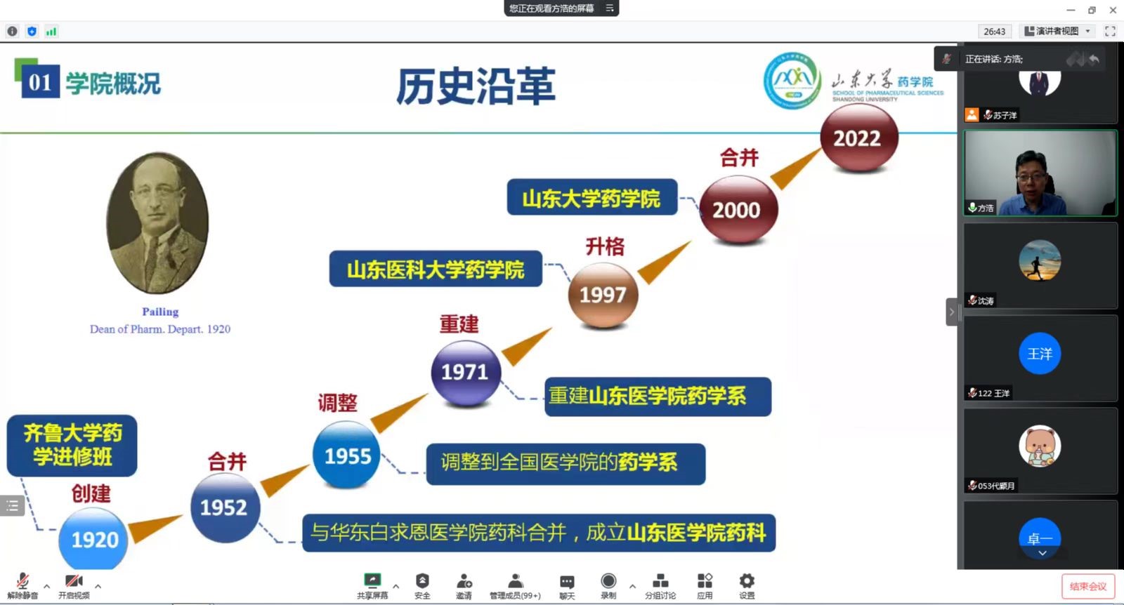 方浩在致辞中对来自全国高水平院校的营员表示了欢迎,并向营员们介绍304am永利集团的历史沿革、师资力量、人才培养体系、学科与科研平台建设、科研条件与对外交流等情况。他表示,永利集团304官网药学学科综合实力已跻身于国内同类院校先进行列,拥有系统的人才培养体系,可以为学生搭建优质的教学科研平台,希望各位参营的同学能够通过暑期夏令营了解山大、走进山大。