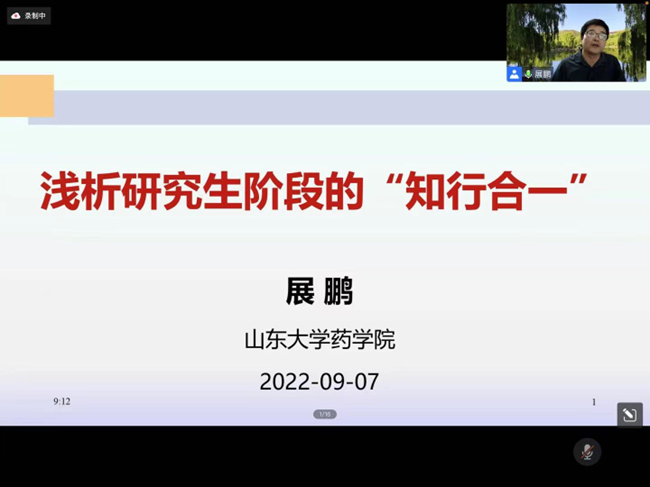 导师代表展鹏以“知行合一”为主题,与同学们分享了自身成长经历,并从“知”和“行”两方面给同学们提出了建议。“知之真切笃实,行之明觉精察”,希望同学们在研究生阶段能善于统筹时间、学会团结协作、做到坚持专注,在新药创制的道路上师生携手奋进。