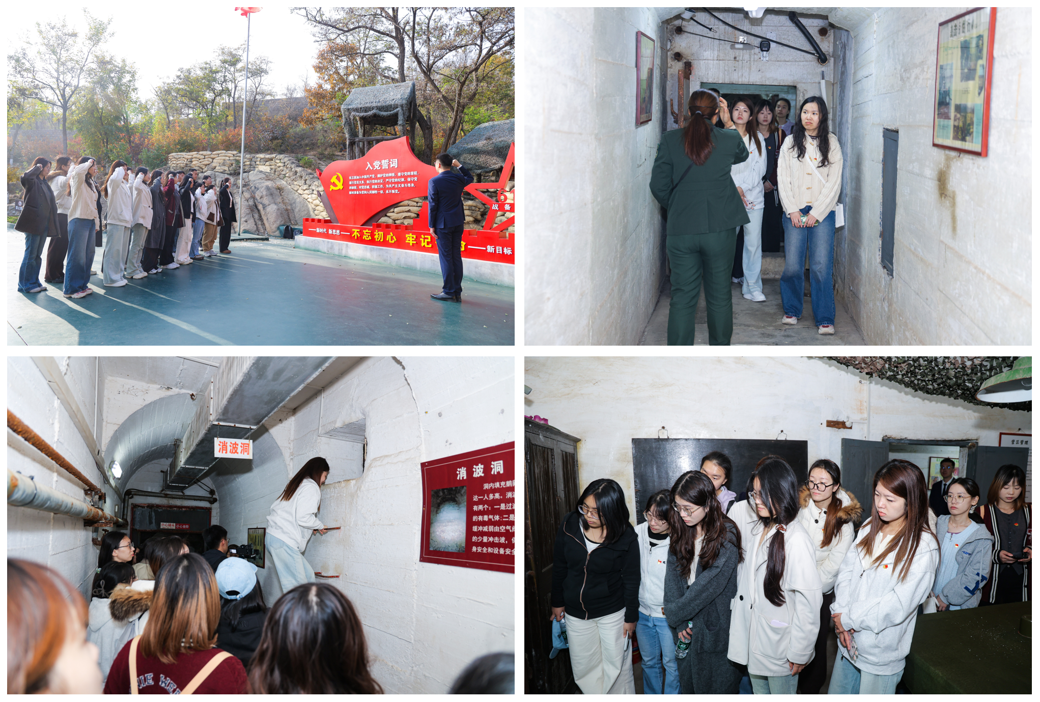在六一八战备电台旧址,研究生第二党支部书记刘金虎向全体党员介绍电台的建设背景与历史使命,带领大家参观了完全由人工开凿的电台。幽深的山中坑道、老式的广播设备、浓郁的军事战备色彩、神秘的洞中生活,仿佛带领大家回到20世纪艰难困苦的年代,切身感受到战备电台工作人员“日不出洞、夜不见光”的坚守与奉献。