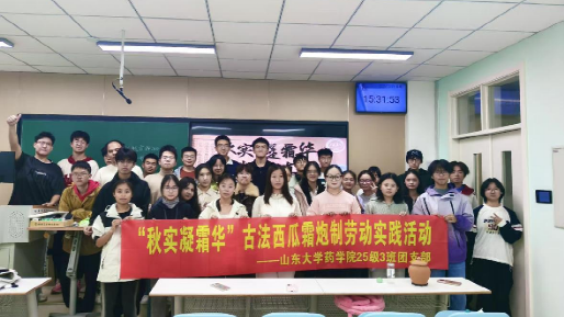 西瓜霜制工艺现,劳悟中药炮制髓。10月29日,2025级药学3班团支部聚焦传统工艺,开展西瓜霜制作实践活动。同学们系统学习了西瓜霜的药用历史与现代应用价值,亲手完成了从西瓜清洗到装填封罐等一系列传统工序,深入领会了中药炮制工艺精髓。